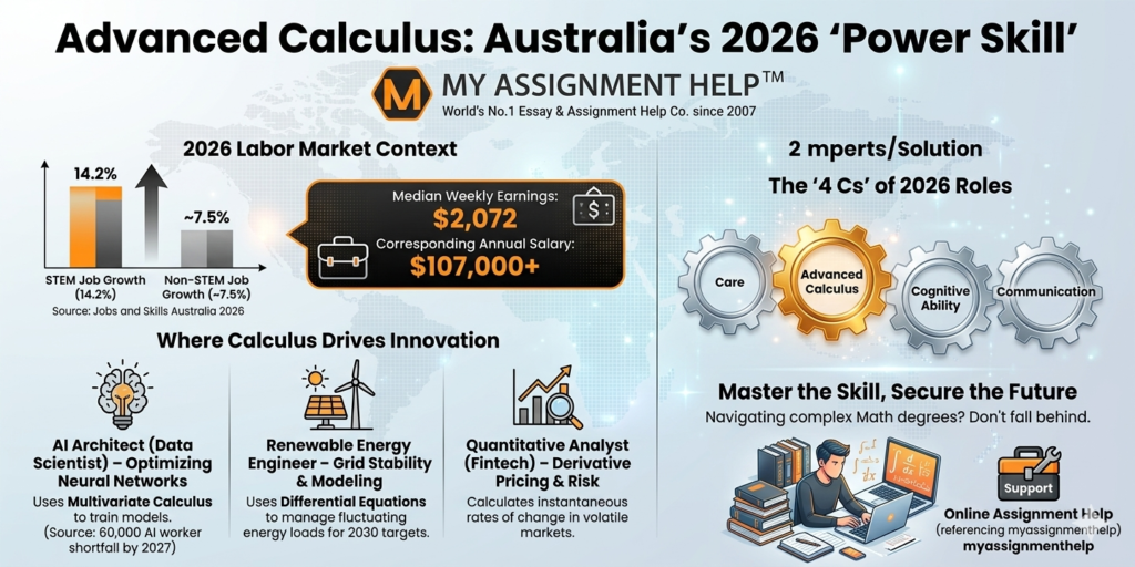 According to recent data from Jobs and Skills Australia (2026), STEM-based roles are currently growing at 14.2%, nearly twice the rate of non-STEM occupations. This surge is largely driven by the “4 Cs”: Care, Computing, Cognitive ability, and Communication. However, it is the “Computing” and “Cognitive” pillars where advanced calculus truly shines.